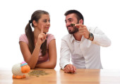 Młoda piękna kobieta z nami Dolar pieniądze w ręce nad białym tle
