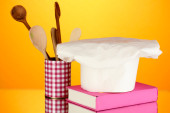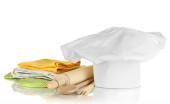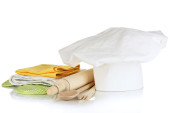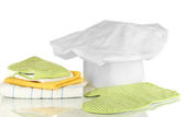 Kucharski kapelusik z ręczniki kuchenne, chwytaków i na białym tle naczynia kuchenne
