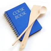 Kucharski kapelusik z łyżki i książka kucharz na białym tle