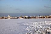Panorama krążownika Aurora w Sankt Petersburgu zimą