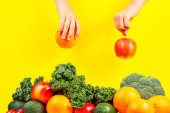 Kobieta ręka gospodarstwa kilka kapusta pozostawia na żółtym tle