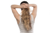 piękne młode trzymając włosy w kucyk na białym tle