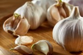 Czosnek z bliska na drewnianej tablicy na tle rustykalnym, płytkiej głębi pola, Selektywny fokus, makro