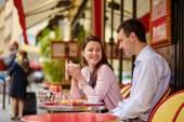 Piekna Francuzke, picia kawy w kawiarni na świeżym powietrzu w Paryż, Francja