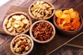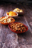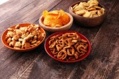 Słone przekąski. Precle, chipsy, krakersy w drewniane miski.