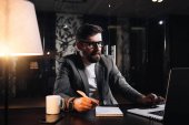 Zdjęcie "Brodaty młodych współpracowników pisać tekst na nowoczesny laptop w biurze loft w nocy. Proces pracy biznesmen. Człowiek za pomocą współczesnych notebooków. Efekt filmu" może być wykorzystywane do celów osobistych i komercyjnych zgodnie z warunkami zakupionej licencji Royalty-free. Obraz jest dostępny do pobrania w jakości wysokiej rozdzielczości do 5760x3840.