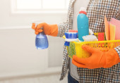 Kobieta z czyszczenia sprzęt gotowy do czyszczenia pokoju