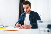 Zdjęcie "Brodaty młody biznesmen w okularach siedzi przez drewniany stół z lampa i za pomocą współczesnej przenośnych notebooków w biurze loft w nocy. Proces pracy współpracownika. Efekt filmu" może być wykorzystywane do celów osobistych i komercyjnych zgodnie z warunkami zakupionej licencji Royalty-free. Obraz jest dostępny do pobrania w jakości wysokiej rozdzielczości do 5760x3840.