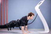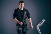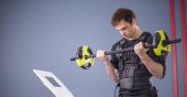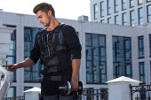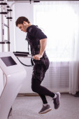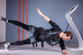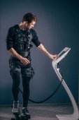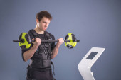 człowiek w garniturze elektrostymulacja mięśni, stojąc z hantlami