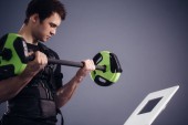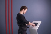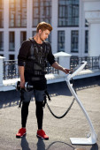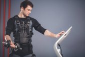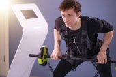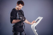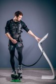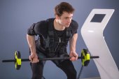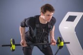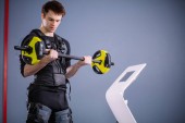 człowiek w garniturze elektrostymulacja mięśni, stojąc z hantlami