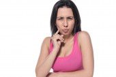 Młoda brunetka dziewczyna z długimi włosami na białym tle