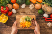 Sałatka ziemniaczana w kuchni do cięcia męskie dłonie. Widok z góry.