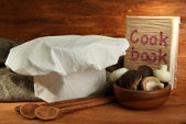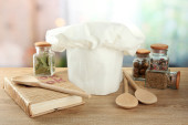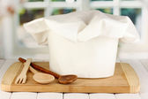Kucharski kapelusik z łyżki na pokładzie na drewnianym stole na tle okna