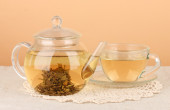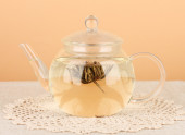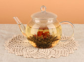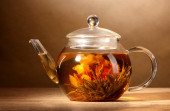 egzotyczne zielonej herbaty z kwiatami w szklany czajnik na stole na kolor background.process co herbata
