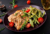 Zdjęcie "Grillowana pierś z kurczaka i sałatką ze świeżych warzyw - pomidory, ogórki i liśćmi sałaty. Sałatka z kurczaka. Zdrowe jedzenie. Leżał z płaskim. Widok z góry" może być wykorzystywane do celów osobistych i komercyjnych zgodnie z warunkami zakupionej licencji Royalty-free. Obraz jest dostępny do pobrania w jakości wysokiej rozdzielczości do 5760x3840.