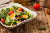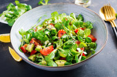 Dietetyczne menu. Dania kuchni wegańskiej. Zdrowa Sałatka z rukolą, pomidorami i orzeszkami pinii.