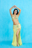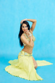 Uroczy tancerz wykonuje Orientalny taniec brzucha na niebieskim tle.