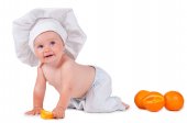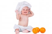 Małe dziecko zje plasterek pomarańczy w garniturze kucharz na białym tle.