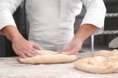 przycięte strzał kobiece piekarz wyrabia ciasto na ciasta na brudny stół