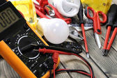 Widok z góry pracy narzędzi i komponentów elektrycznych systemu na rustykalne drewniane tła