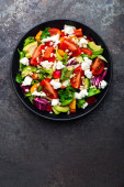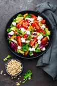 Warzywne danie, Sałatka z awokado, papryki, pomidorów, włoski mix, świeża sałata, ser feta i orzeszkami pinii. Zdrowe jedzenie. Widok z góry