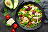 Zdjęcie "Warzywne danie, Sałatka z awokado, papryki, pomidorów, włoski mix, świeża sałata, ser feta i orzeszkami pinii. Zdrowe jedzenie. Widok z góry" może być wykorzystywane do celów osobistych i komercyjnych zgodnie z warunkami zakupionej licencji Royalty-free. Obraz jest dostępny do pobrania w jakości wysokiej rozdzielczości do 5760x3840.
