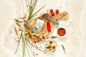 Świeże posiekane kapusta przygotowane z pomidorkami na metalowej tacy z nożem z miejsca kopii