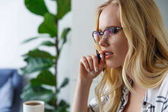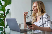 Piękna Blondynka kobieta zamyślony korzysta z laptopa podczas pracy w domu