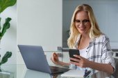Zdjęcie "Piękna Blondynka kobieta zamyślony korzysta z laptopa podczas pracy w domu" może być wykorzystywane do celów osobistych i komercyjnych zgodnie z warunkami zakupionej licencji Royalty-free. Obraz jest dostępny do pobrania w jakości wysokiej rozdzielczości do 5760x3840.
