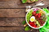 Zdjęcie "Grillowana pierś z kurczaka. Smażony filet z kurczaka i sałatką ze świeżych warzyw pomidory, ogórki, pieprz, sałatą i rukolą liści. Mięso z kurczaka z sałatką. Zdrowe jedzenie. Leżał z płaskim. Widok z góry. Podłoże drewniane" może być wykorzystywane do celów osobistych i komercyjnych zgodnie z warunkami zakupionej licencji Royalty-free. Obraz jest dostępny do pobrania w jakości wysokiej rozdzielczości do 5760x3840.