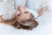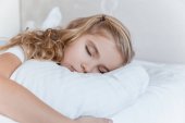piękna młoda kobieta blonde spanie na poduszce biały w łóżku