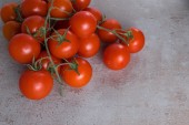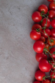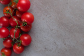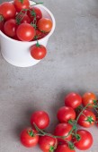świeże czerwone Pomidory czereśniowe w skrzynce z tworzywa sztucznego na pokładzie szary tło