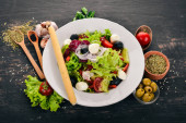 Grecka Sałatka ze świeżych warzyw. Na tle drewnianych. Widok z góry. Miejsce.