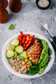 Buddha bowl z Sałatka szpinaku, quinoa, ciecierzyca, grillowanego kurczaka, awokado, pomidory, ogórki, nasiona sezamu.