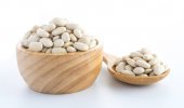 Fasola biała na drewno filiżanka białego na białym tle