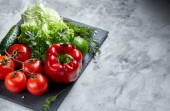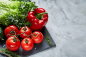 Szczegół martwa bukiet świeżych warzyw i ziół na vintage drewniane tła, widok z góry, Selektywny fokus.