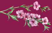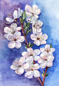 Kwiaty wiśni akwareli. Gałąź ilustracja kwiat kwiatowy na niebieskim tle.