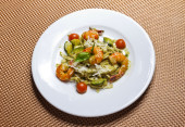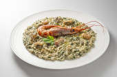 Okrągły biały danie risotto z karczochami i owoce morza
