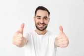 uśmiechnięty młody człowiek pokazujący kciuki do góry.