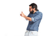 Wesoły, młody człowiek wyświetlone miejsce.