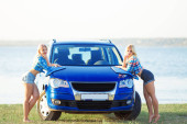 Biała dziewczyna sprawia, że zdjęcia przez telefon, siedząc w okno samochodu
