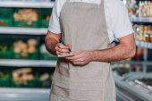 przycięty Zrzut z Subiekt w fartuch, robiąc notatki w notesie w supermarkecie