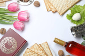 Widok z góry tradycyjne książki z tekstem w języku hebrajskim i matza na stole betonu