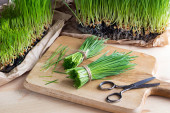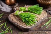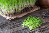 Świeżo zebranych liści pszenicy na drewnianym stole