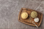 Miseczki i łyżki z różnymi rodzajami mąki na jasnym tle