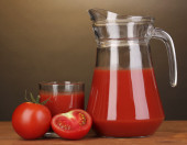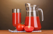 sok pomidorowy w dzban i szkło na drewnianym stole na brązowym tle