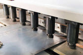 Lakierowanie proszkowe elementów metalowych. Kobieta w strój ochronny spraye farby proszkowej z pistoletu na wyroby metalowe
