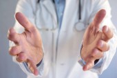 Lekarz z stetoskop i gospodarstwa puste strony. Na białym tle