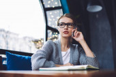 Portret kobiety poważny biznes organizowanie harmonogramu pracy gospodarstwa Notatnik i rozmowy telefoniczne z kolega, kobiece student w okulary, patrząc na kamery podczas rozmowy na telefon komórkowy