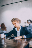 Kobieta sukcesu w biznesie w okularach o pracy zdalnej w café wnętrza sprawdzanie poczty na komputer przenośny, pewnie właściciel kobiece czytanie wiadomości z sieci online wpisując informacje zwrotne na netbook